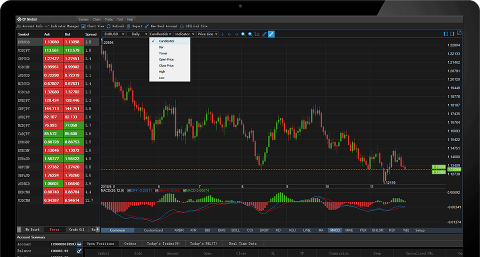 Nhấp lựa chọn góc trên bên phải để chọn loại hình biểu đồ, bao gồm biểu đồ hình nến, dạng thanh, dạng đường